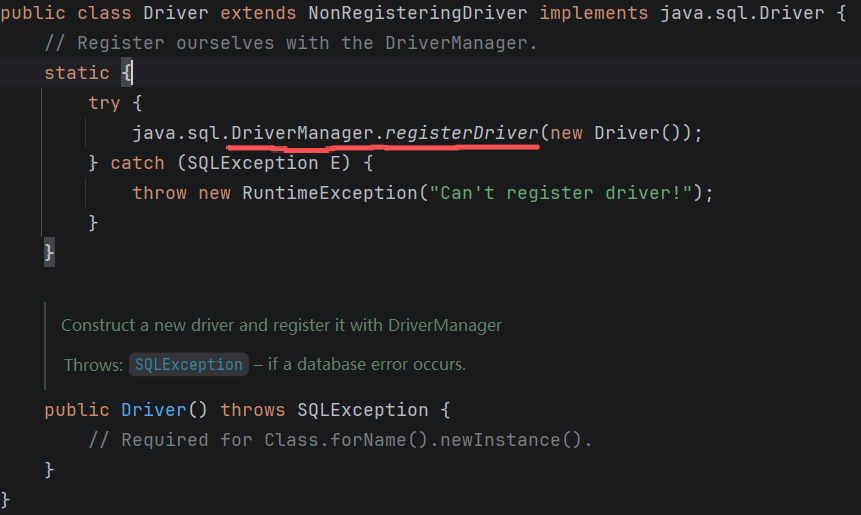 Driver类的静态代码块中,会使用DriverManager类的registerDriver()方法: