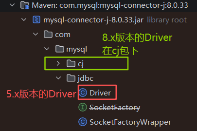 - 另一个驱动类是 com.mysql.cj.jdbc.Driver,它可以连接 8.X系列版本的MySQL数据库。