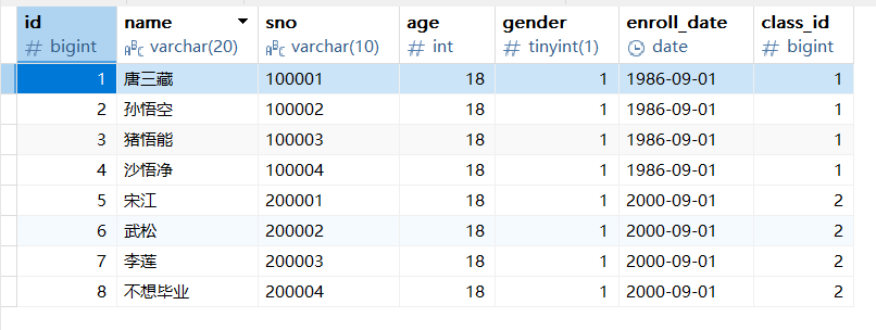 SELECT id, name, sno, age, gender, enroll_date, class_id