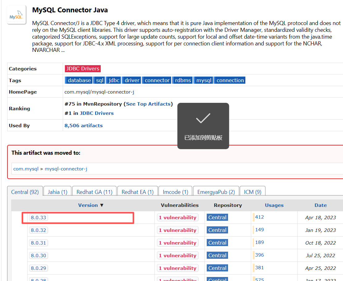进入Maven后,我们选择8.0.33版本的JDBC驱动包: