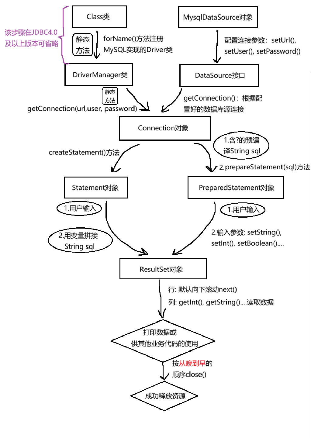 | 使用流程 | 1. 拼接完整SQL 字符串(含参数) 2. connection.createStatement()方法 创建 Statement 对象 3. 执行时传入拼接好的 SQL (如statement.executeQuery(sql)) | 1. 写带?的SQL模板 2. connection.prepareStatement(sql) 方法创建 prepareStatement对象,绑定并预编译 SQL 3.setXxx()填参数 4. 执行时无需再传 SQL (如prepareStatement.executeQuery()) |