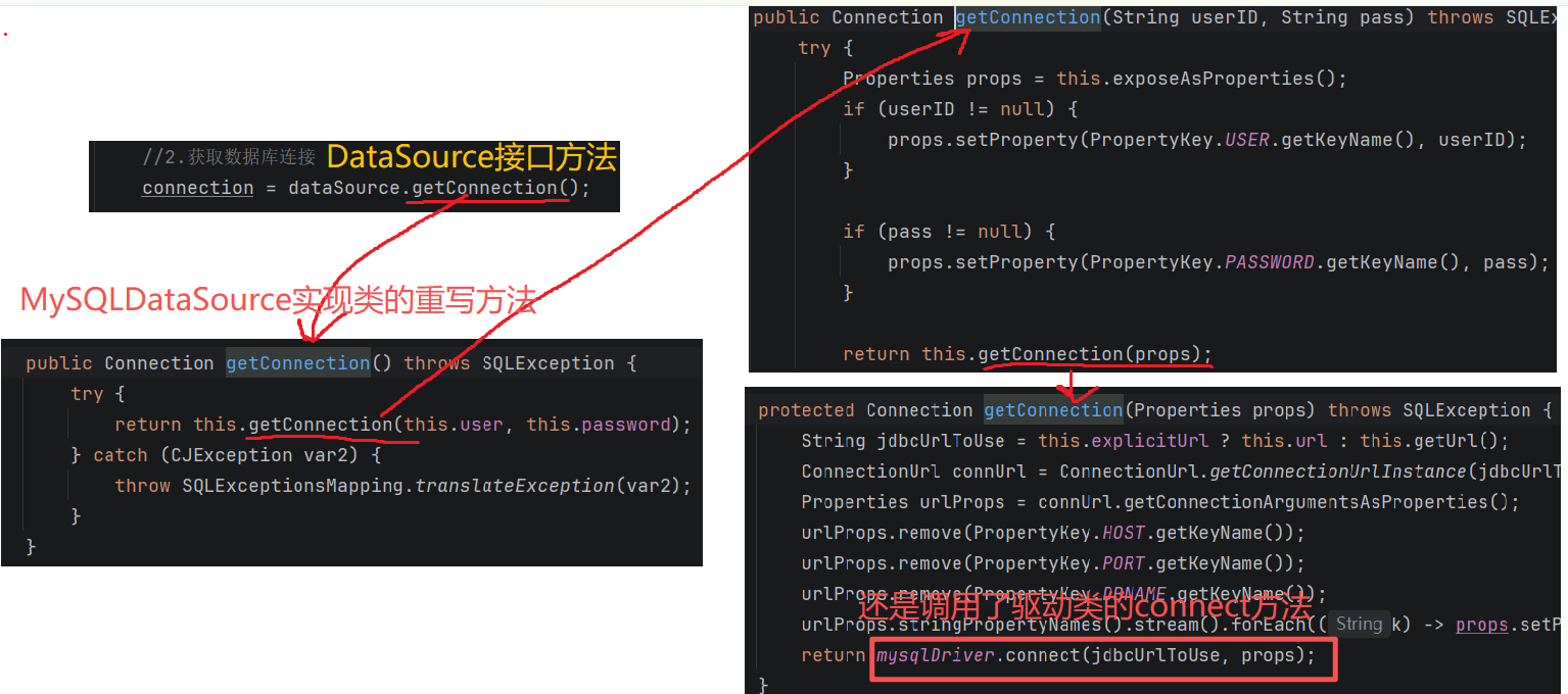- MysqlDataSource类是mysql实现的数据库源对象 ,该类是DataSource的实现类。我们要使用setUrl()、setUser()和setPassword() 这三个方法来配置(封装)数据库源,方便后续通过getConnection()方法直接连接数据库。