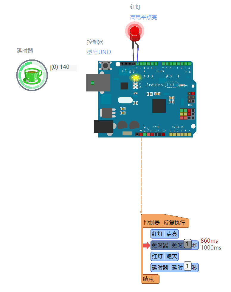 当你将代码上传到Arduino板后,LED会每隔1秒钟闪烁一次。