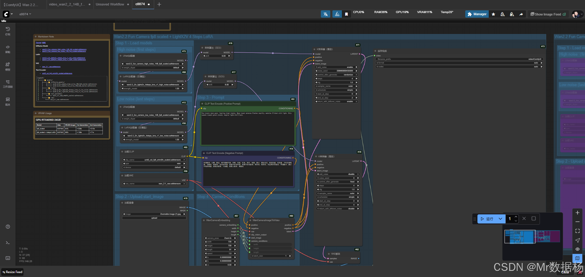 该工作流的运行逻辑以"加载---采样---合成---保存"为主线,从模型与输入图像的准备,到条件控制的注入,再到潜变量的迭代采样与视频输出,形成了完整的生成链路。前期通过高噪声扩散模型与正负面提示词的融合,保证了画面具有充足的动态张力;中期利用低噪声模型逐步收敛结果,使细节更清晰;在此过程中,相机嵌入节点发挥了关键作用,为生成过程提供了类似真实摄影的运动感。最终,潜变量被解码为图像帧,通过视频拼接节点合成为连贯的视频片段,并在保存节点完成导出。