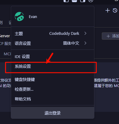 点击CodeBuddy主界面左下角/右上角的齿轮状"设置"图标,或通过顶部菜单栏的「File(文件)」→「Settings(设置)」进入配置面板。