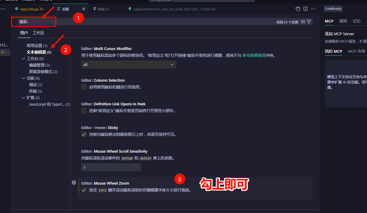 勾选该选项后保存设置,此时即可通过按住Ctrl键(Windows/Linux)/Command键(Mac)+ 鼠标滚轮向上滚动 来放大字体(向下滚动则缩小)。