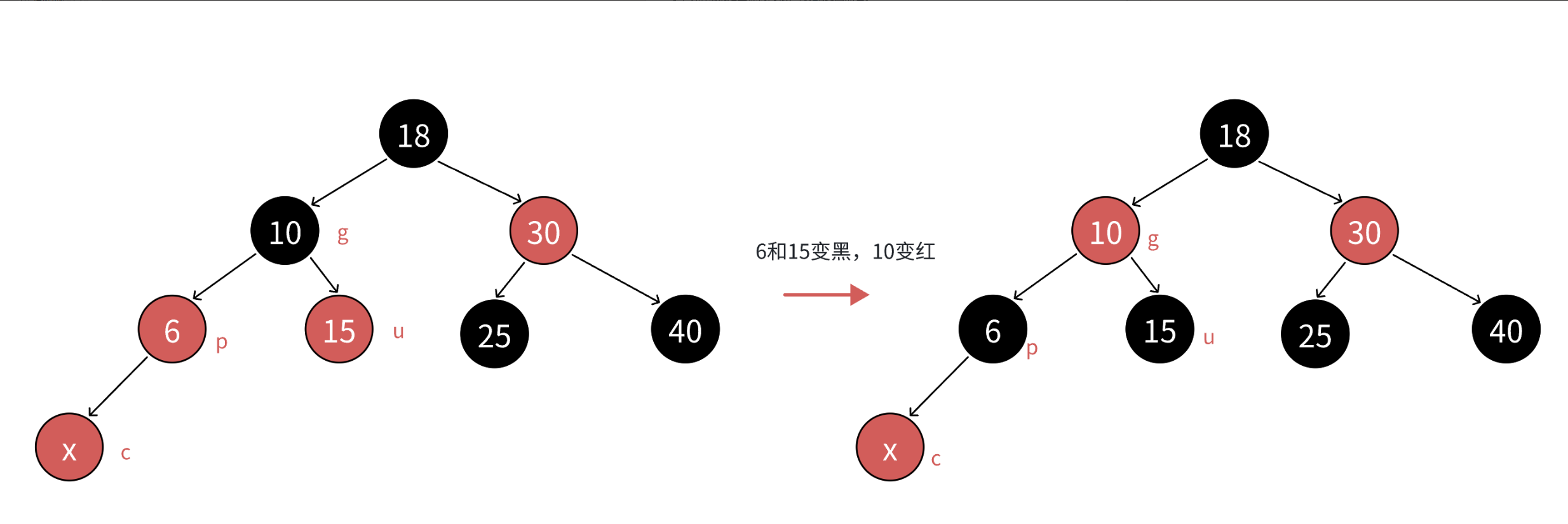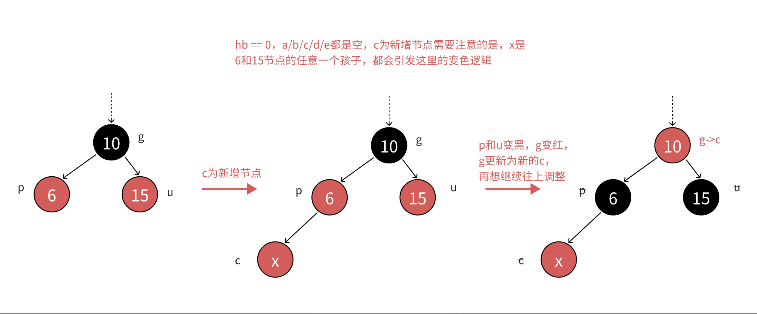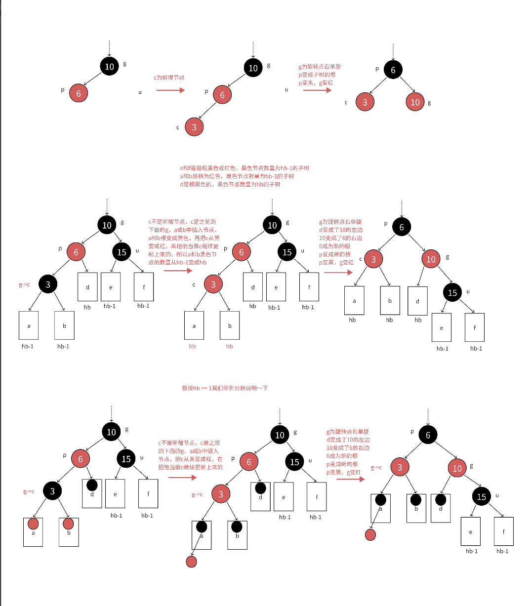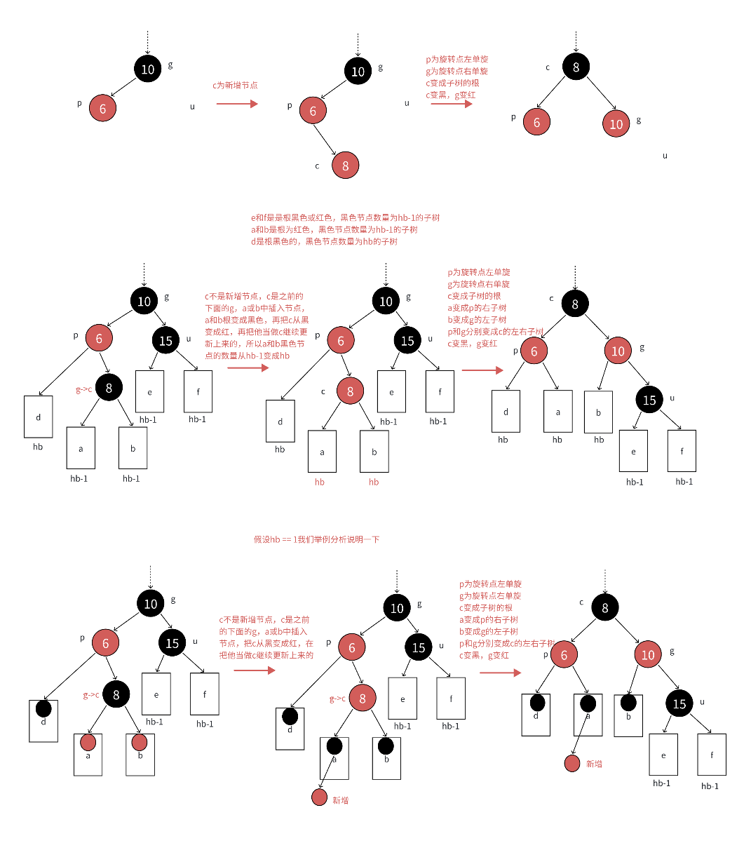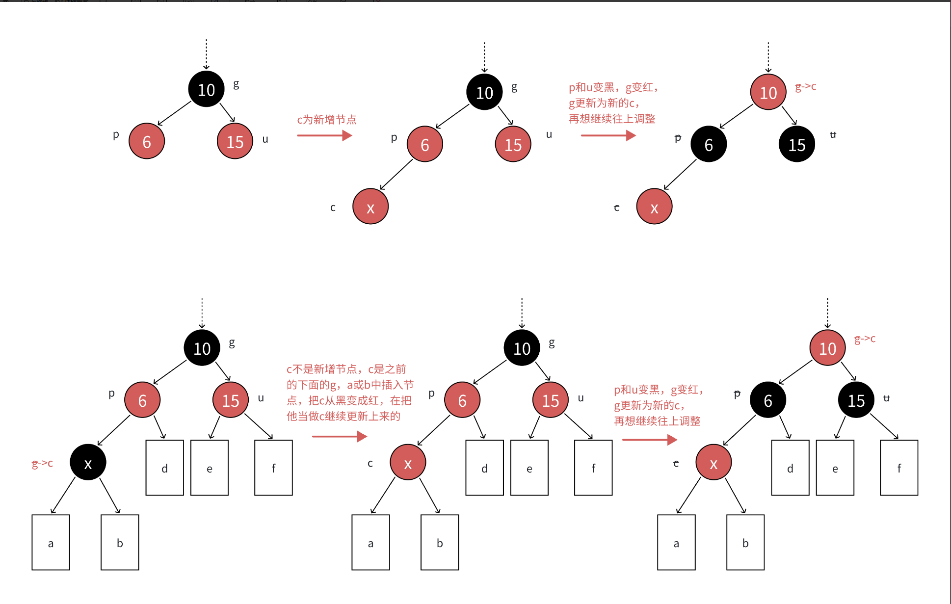 c为红,p为红,g为⿊,u存在且为红,则将p和u变⿊,g变红。在把g当做新的c,继续往上更新。