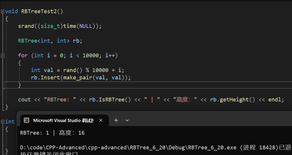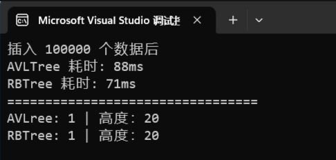 cppvoid RBTreeTest2() { srand((size_t)time(NULL)); AVLTree<int, int> av; RBTree<int, int> rb; int begin1, begin2, end1, end2, time1 = 0, time2 = 0; int n = 100000; int sum = 0; for (int i = 0; i < n; i++) { int val = (rand() + i) * sum; sum ++; begin1 = clock(); av.Insert(make_pair(val, val)); end1 = clock(); begin2 = clock(); rb.Insert(make_pair(val, val)); end2 = clock(); time1 += (end1 - begin1); time2 += (end2 - begin2); } cout << "插入 " << sum << " 个数据后" << endl; cout << "AVLTree 耗时: " << time1 << "ms" << endl; cout << "RBTree 耗时: " << time2 << "ms" << endl; cout << "=================================" << endl; cout << "AVLree: " << av.IsAVLTree() << " | " << "高度:" << av.getHeight() << endl; cout << "RBTree: " << rb.IsRBTree() << " | " << "高度:" << rb.getHeight() << endl; }此时数据量太小了,还不能体现 红黑树 的价值,还好这次测试,红黑 比 AVL 强