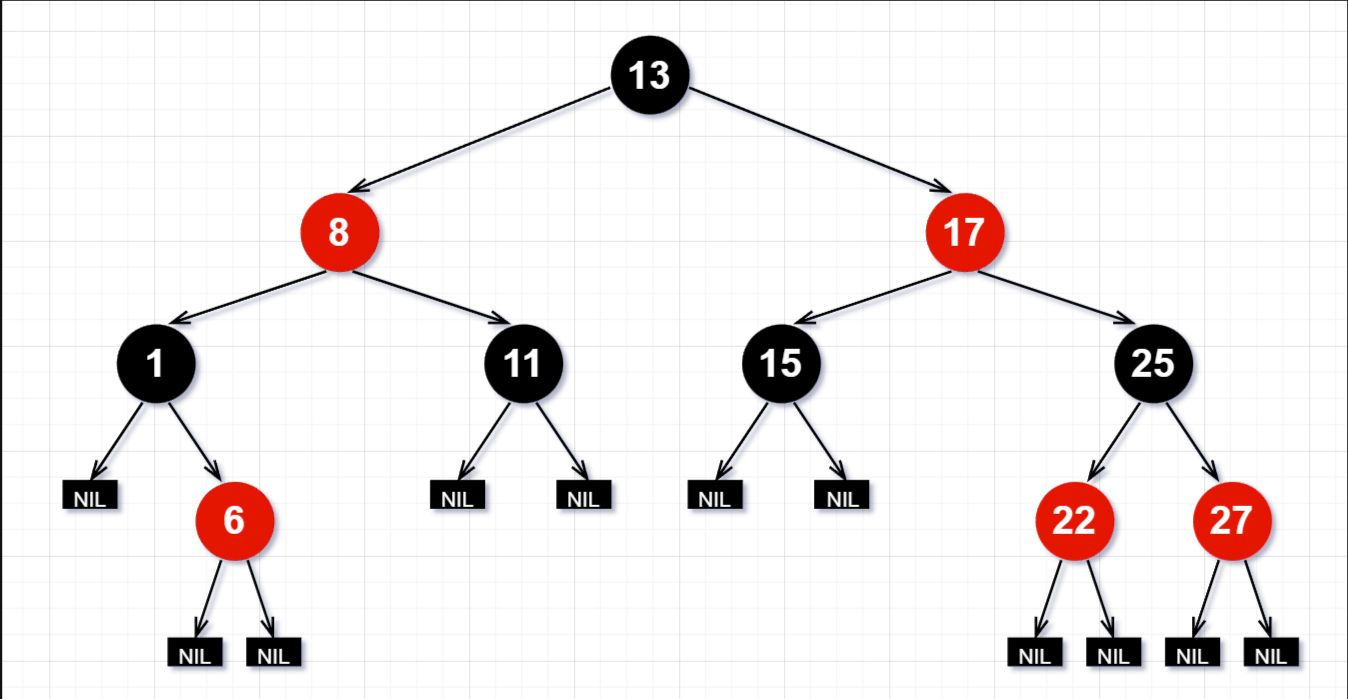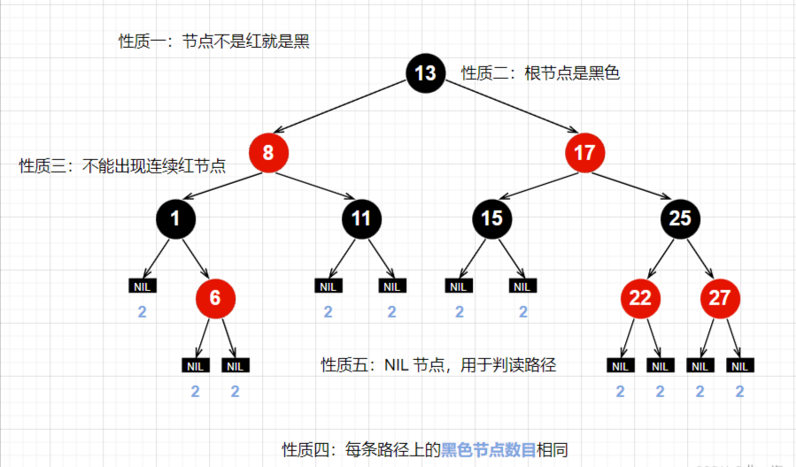 - 对于每个节点,从该节点到其所有后代的 NIF 节点的简单路径上,都包含相同数目的黑色节点(每条路径上都有相同数目的 黑色 节点)