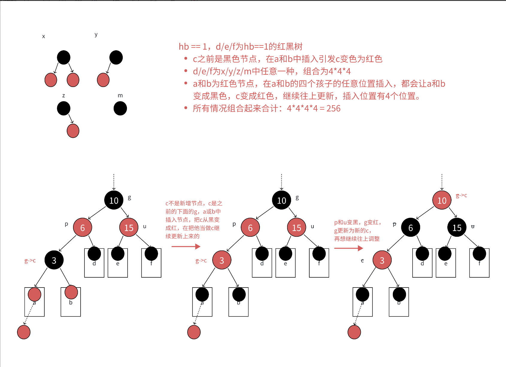 •图1将以上类似的处理进⾏了抽象表达,d/e/f代表每条路径拥有hb个⿊⾊结点的⼦树,a/b代表每条路径拥有hb-1个⿊⾊结点的根为红的⼦树,hb>=0。