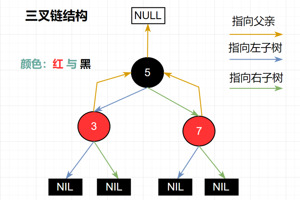 红黑树 也是 三叉链 结构,不过它没有 平衡因子 ,取而代之的是 颜色