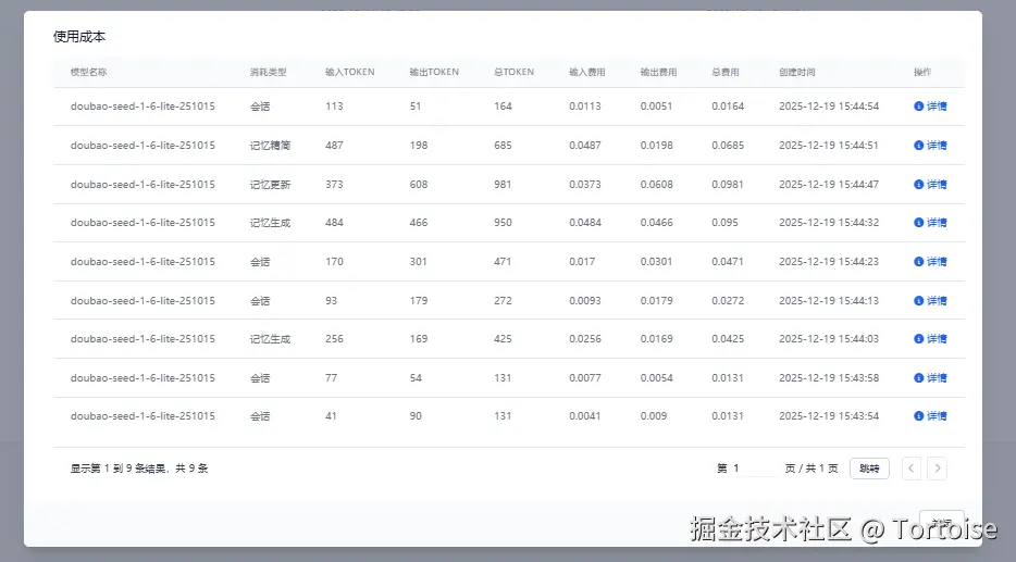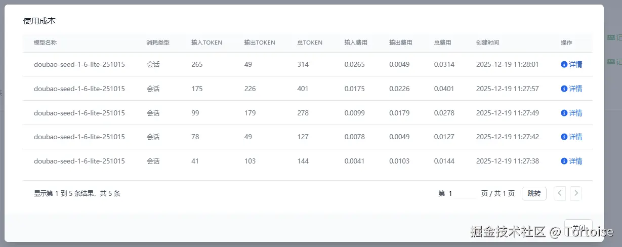 此页面详细列出该会话产生的所有Token消耗及对应的成本计算。