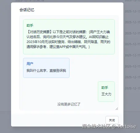 从对话可以看到,最后一问的时候回答出了我们的名字,与截断不同 再看当前的记忆