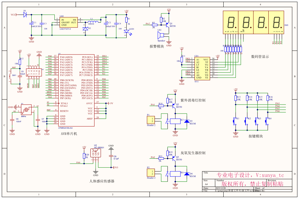本设计以 ATMEGA168 单片机为核心,针对公共场所 / 家庭场景的消毒需求,实现一款集定时消毒、人体感应防护、多模式消毒、状态显示 于一体的智能消毒机系统。系统支持紫外线 / 臭氧两种主流消毒方式(可按需选配),通过人体红外传感器实现 "有人即停" 的安全防护,同时提供按键设置消毒时长、蜂鸣器报警、LED 状态指示等功能,兼顾实用性与安全性。