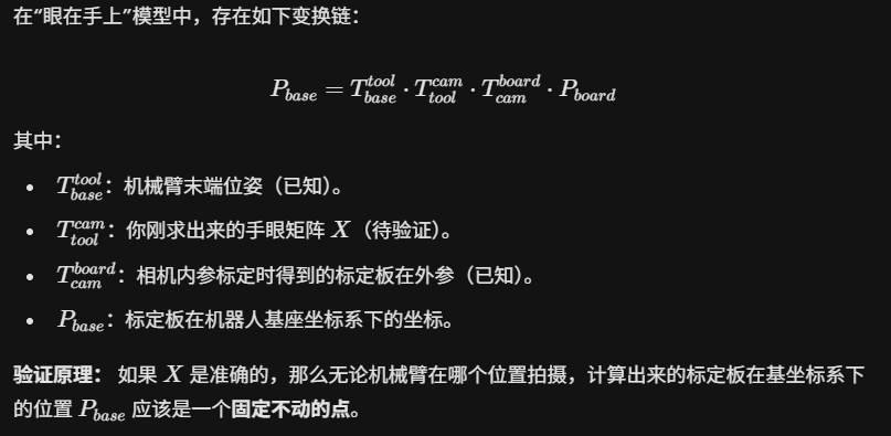 - 用求解出的 X,将机械臂末端的 3D 坐标(或标定板的 3D 坐标)投影到相机图像上,计算投影点与实际像素点的距离(重投影误差);