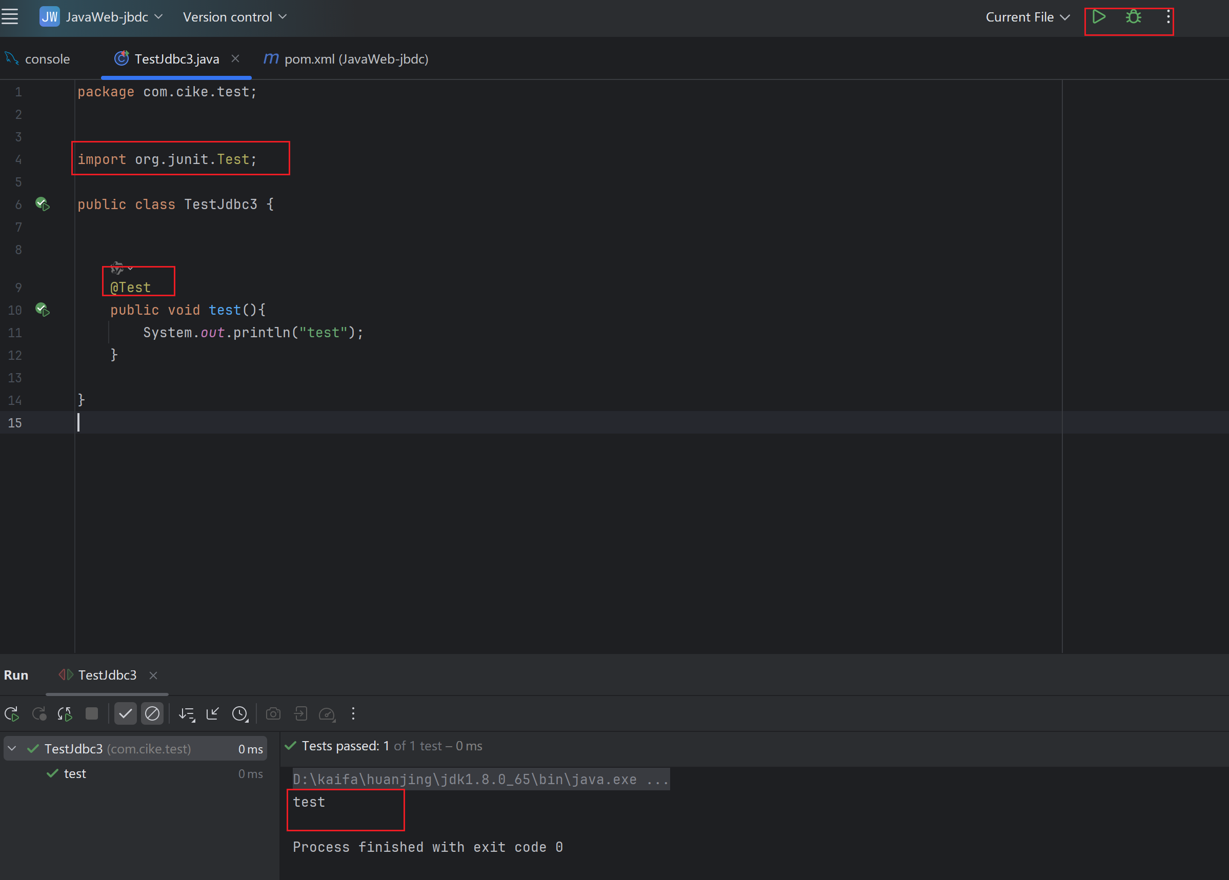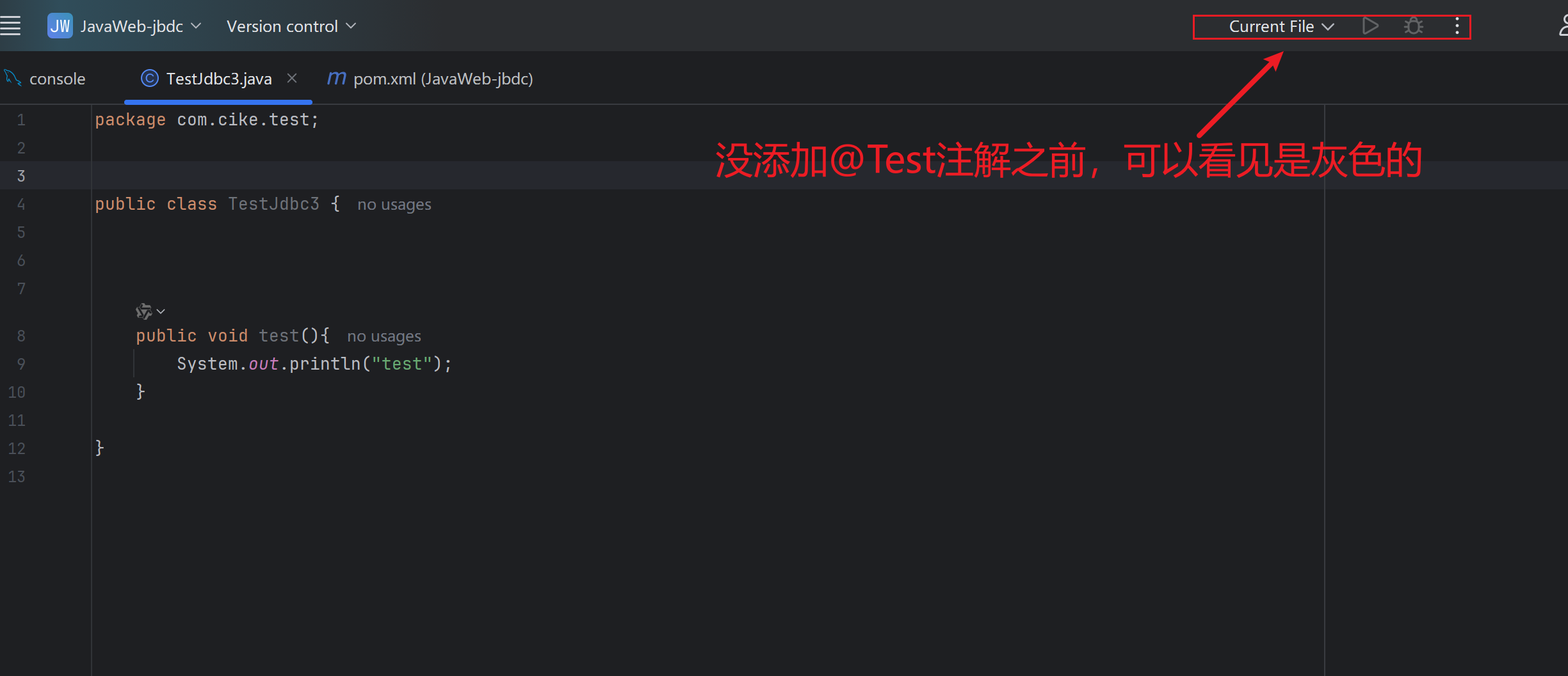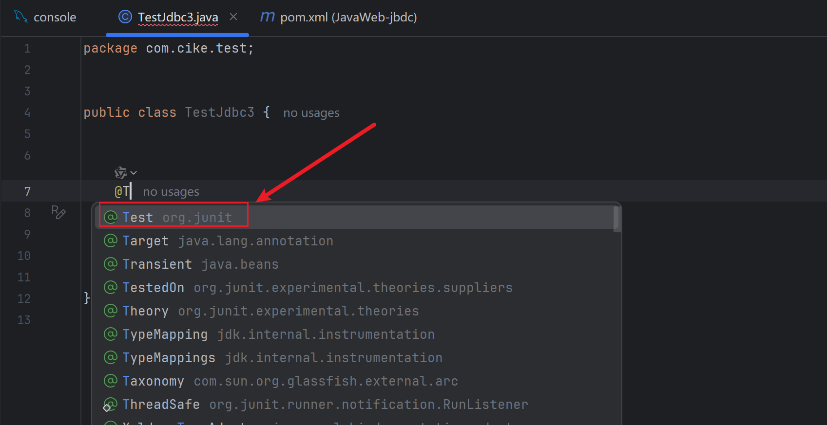 @Test注解只有在方法上有效,只要加了这个注解的方法,就可以直接运行!
