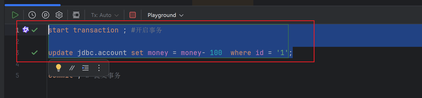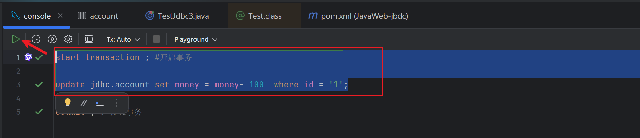 String sql = "update jdbc.account set money = money - 100 where id = 2;";