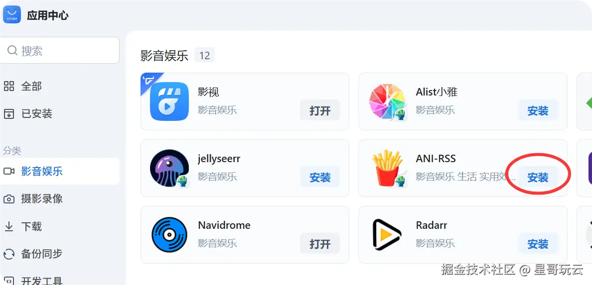 在飞牛nas中部署ani-rss是相当简单,只需要点击安装即可!