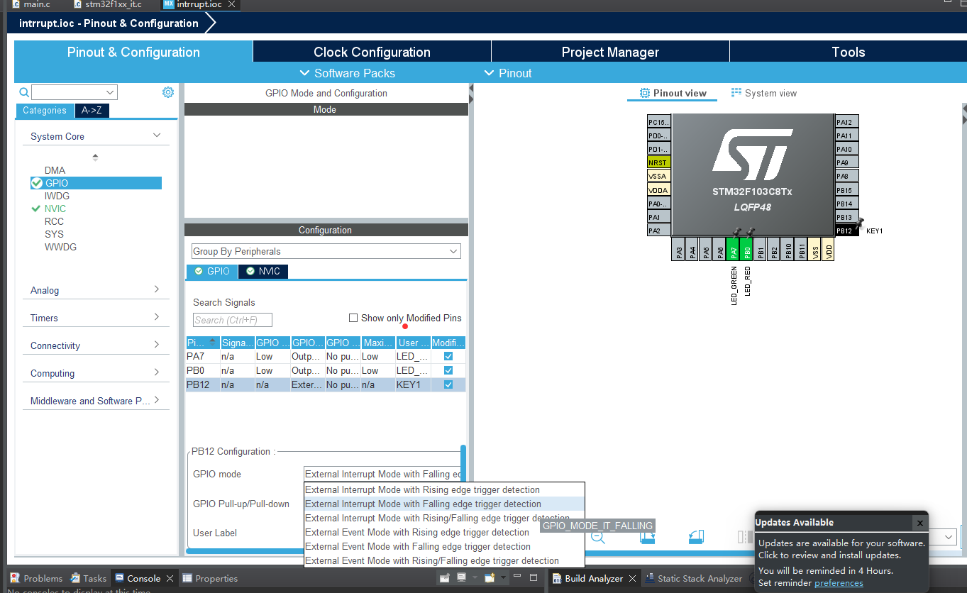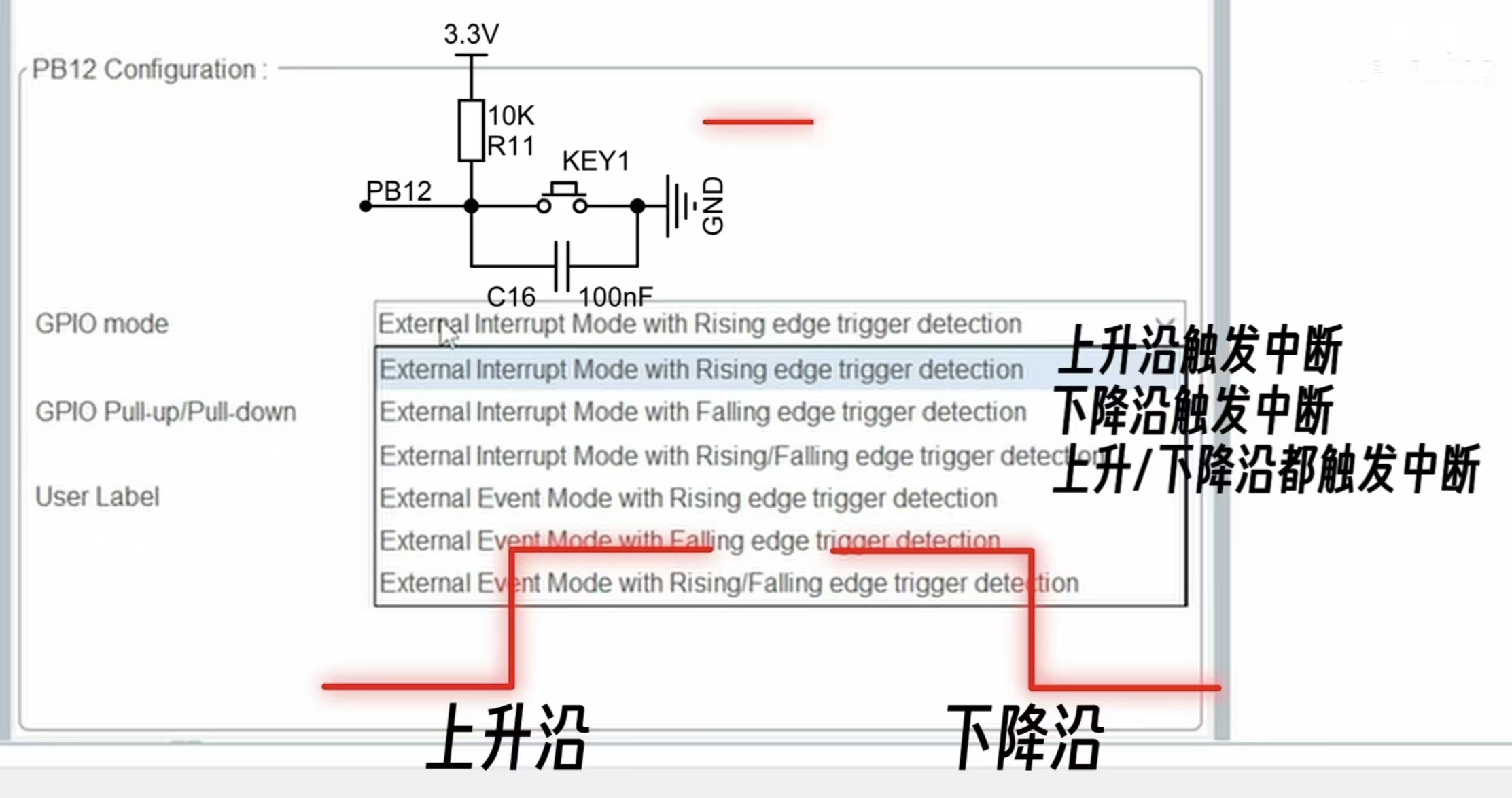 在BP12口 GPIO GPIO mode 下选择下降沿触发