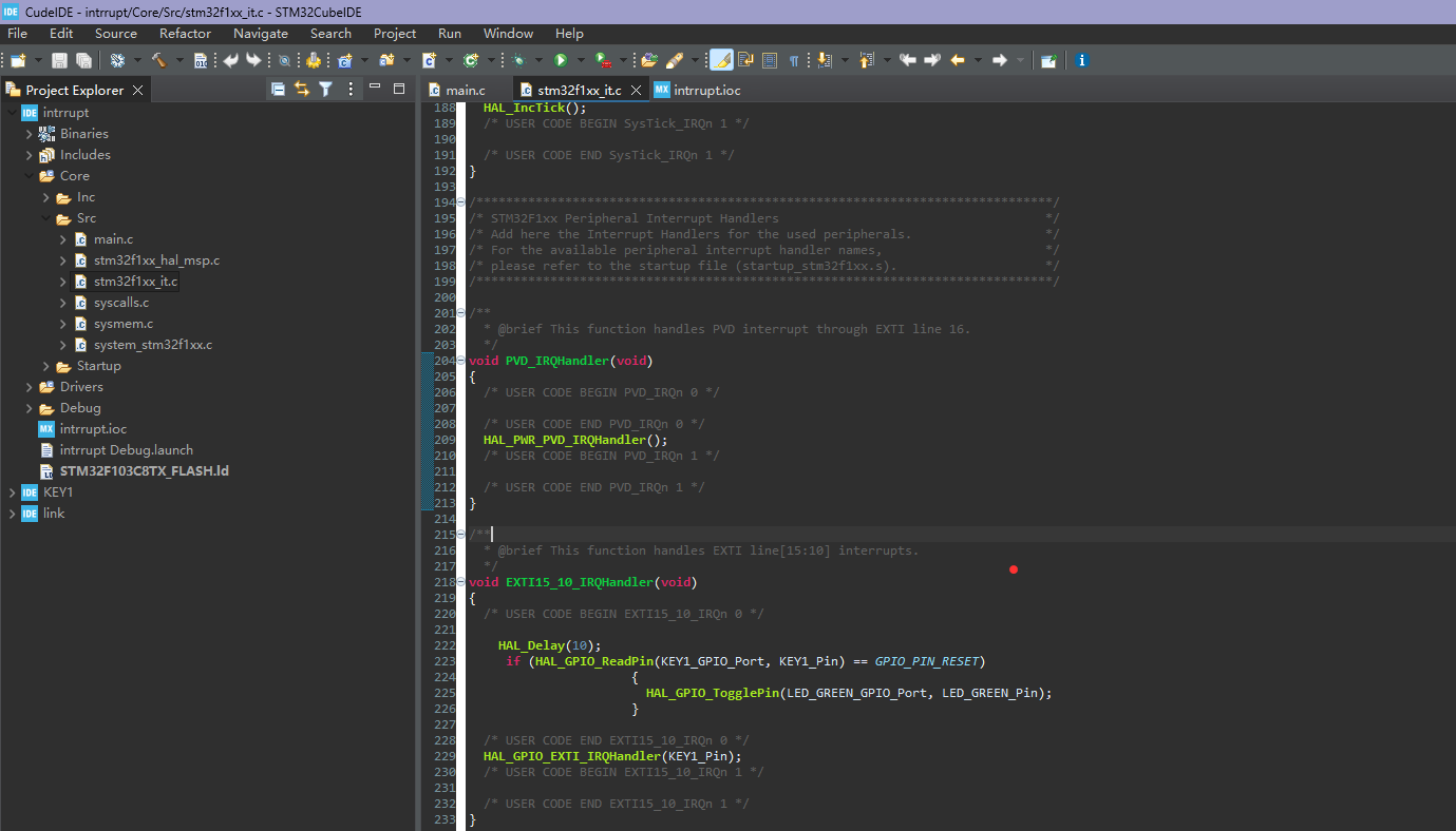 打开Core文件 找到Src下的stm32f1xx_it.c 在void EXTI15_10_IRQHandler(void)函数里写入命令