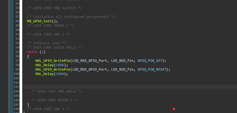 运行以上代码后发现LED_RED延时亮灭可以实现,而LED_GREEN 按下KEY1按键实现亮灭无法实现。是因为在while循环中每次执行if条件时会先进行HAL_Delay();延时,之后在进行if判断。这使得按键控制需要按下4秒后抬起才会判断执行亮灭。