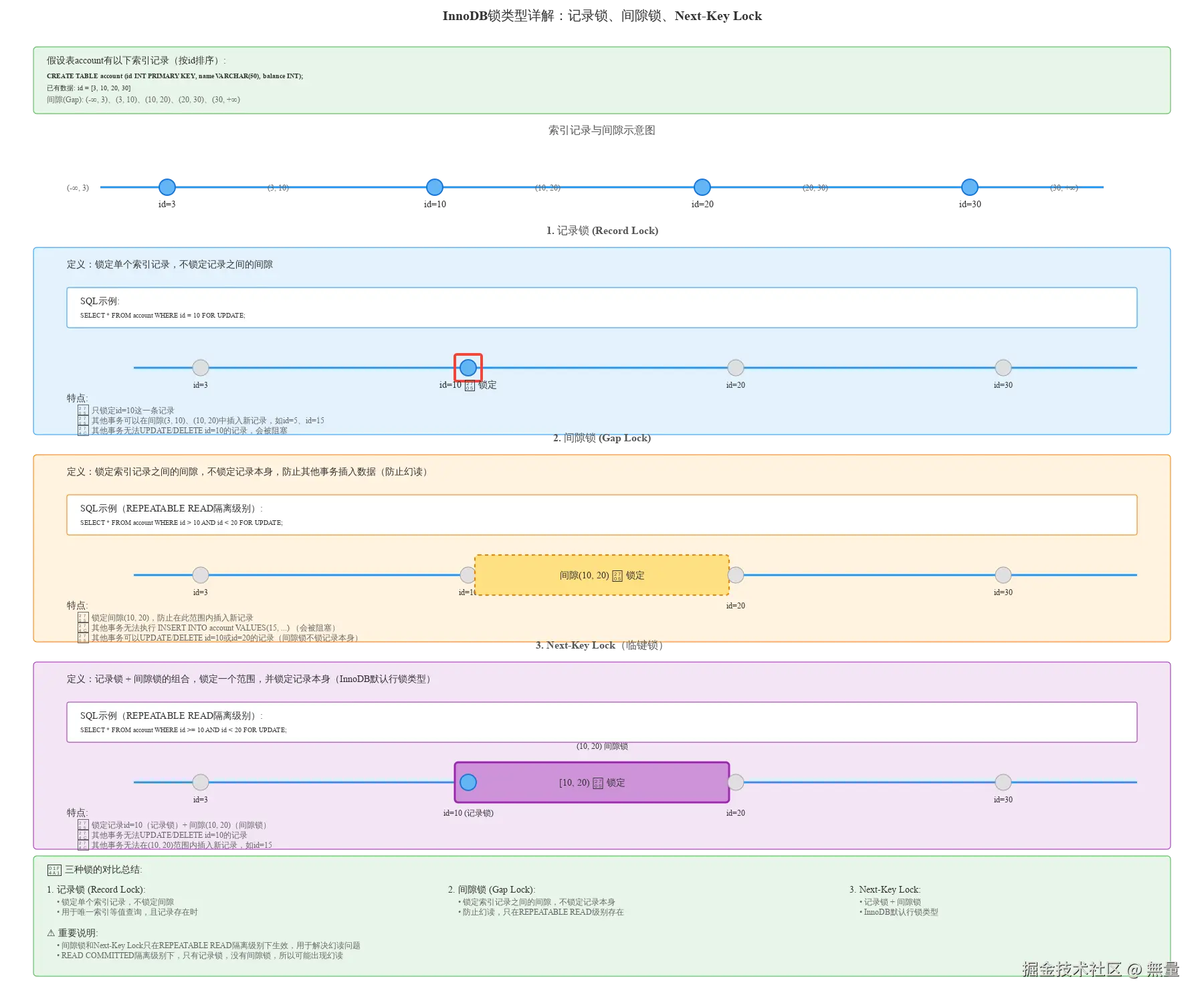 - 记录锁(锁单行)、间隙锁(锁间隙)、Next-Key Lock(锁行+间隙,防幻读)