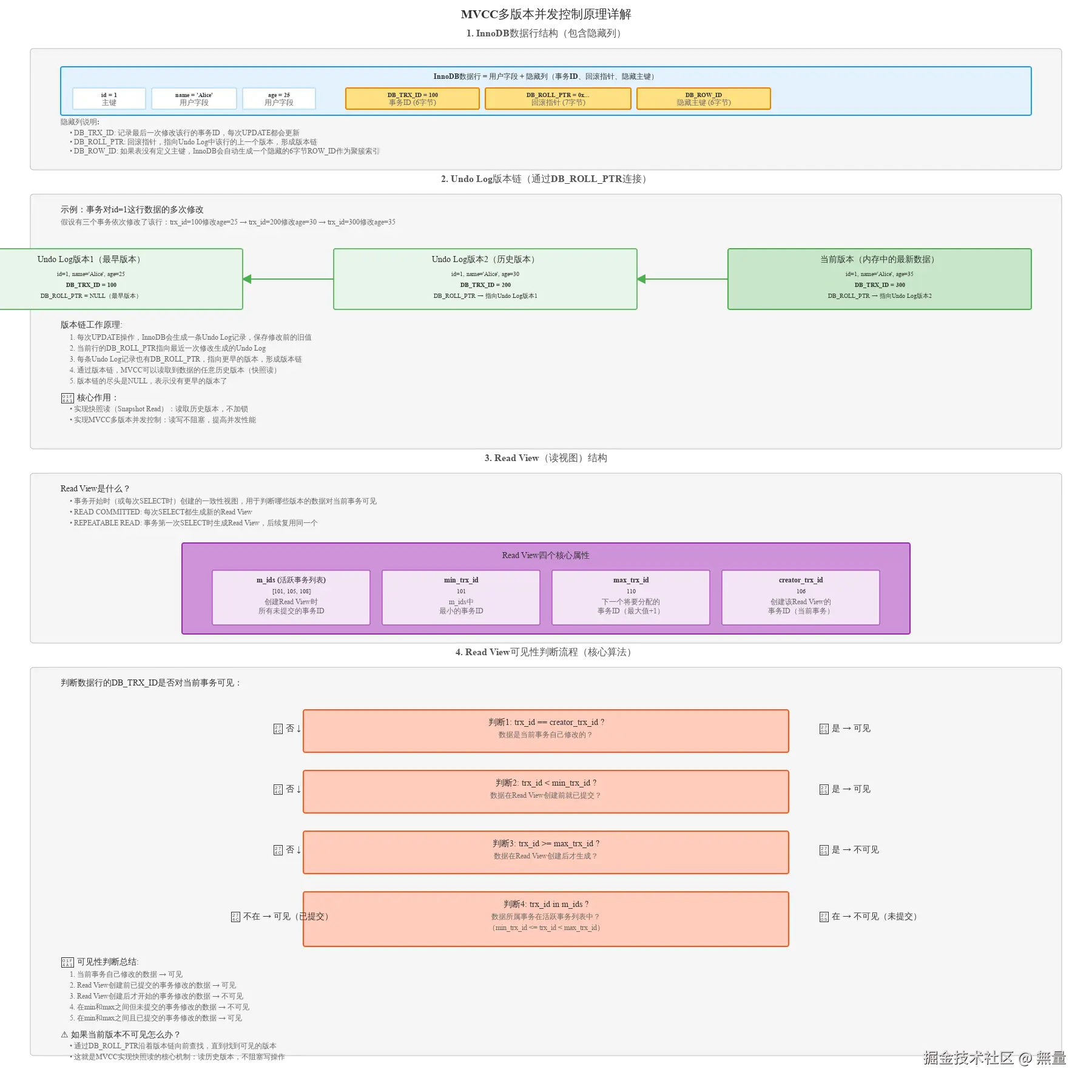 - 隐藏列(DB_TRX_ID、DB_ROLL_PTR) + Undo Log版本链 + Read View可见性判断