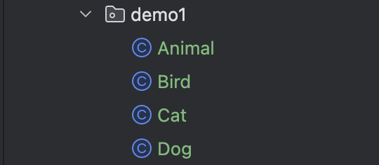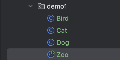 我们先创建三个文件来存放三个类,Zoo为测试类,文件结构如下: