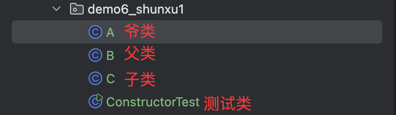 | 5. 构造方法调用顺序:从父类到子类(A → B → C) | 先祖先后后代 |
