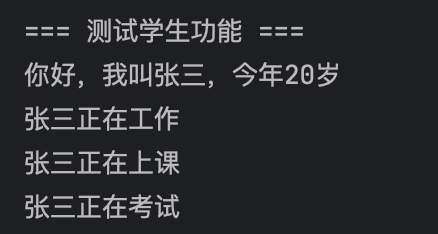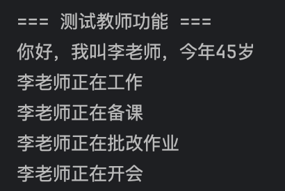 我们发现确实成功访问了我们的所有方法,但是大家再看看我们的Zoo测试类,我嘛会发现很多动物的方法是一样的呀 ,只有最后一个是不同的,其实大家结合为一开始给出的生活中的例子就能想到,**前三个共同有的方法不就是他们身为动物的共性吗?**那么这个时候我们来使用继承的方法给Zoo类优化一下: