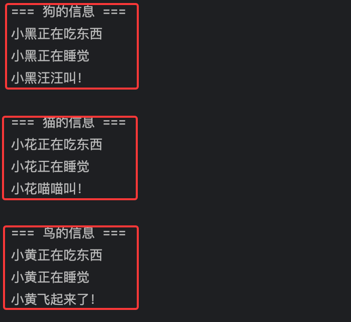 首先我们会发现,我们给各个类都定义了两个成员变量,然后各自定义两个相同的成员方法,但是最后一个方法是各个动物所独有的,那么我们在测试类想要去访问他们的所有成员变量方法就会像下面的代码一样: