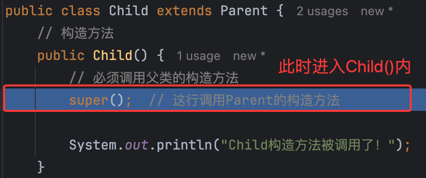 | 1. 创建子类对象,必须先初始化父类 | Java 自动帮你一层层调用父类构造方法 |