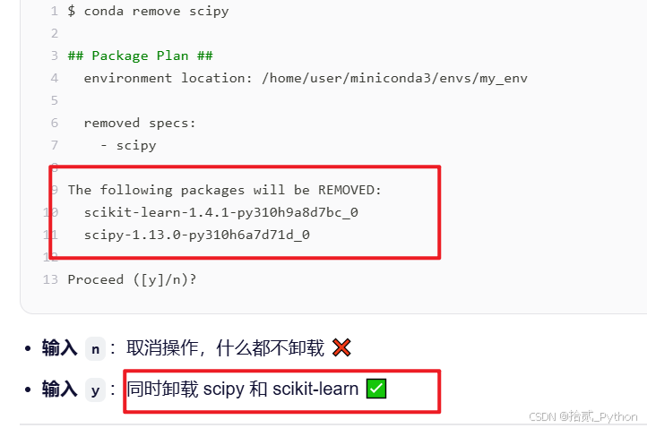 》 ⚠️ conda 会明确列出将被移除的包,包括所有依赖 scipy 的包(主要是 scikit-learn)