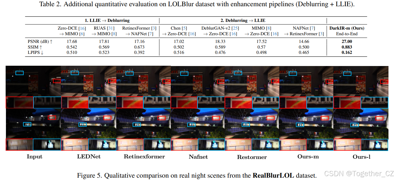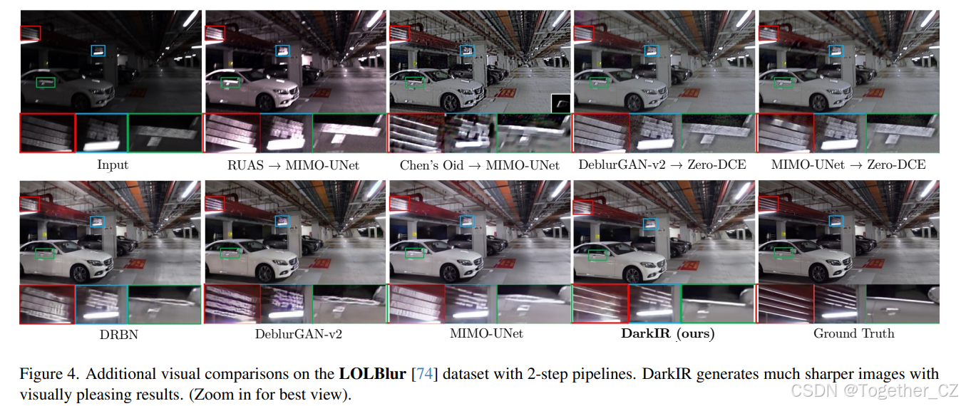 表 2 对比两步流水线,DarkIR 优势明显。图 4 展示更多细节与锐度。