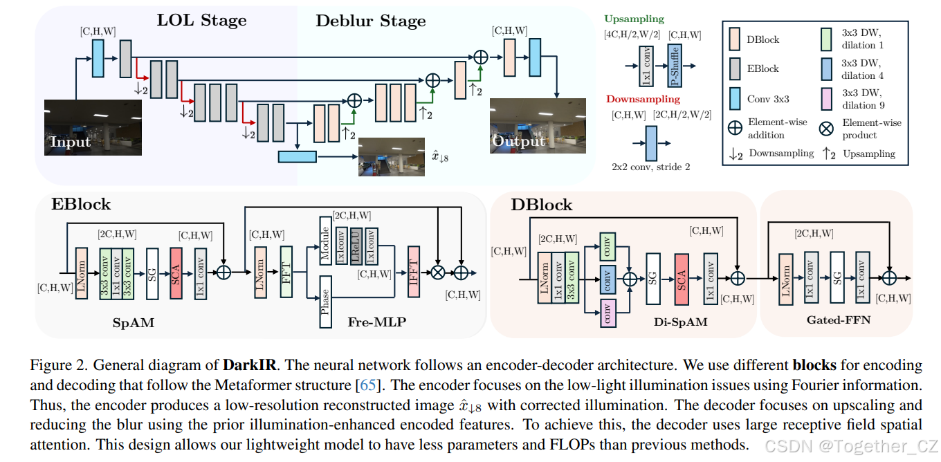 图 2 展示了我们的模型。与多数方法不同,我们在编码器与解码器使用不同模块。此非对称设计的核心思想是:在编码器低分辨率阶段完成低光照增强,在解码器阶段去模糊,类似 LEDNet [74]。解码器利用编码器提供的已增强特征,专注于上采样并提升低分辨率重建 x^↓8 的清晰度。