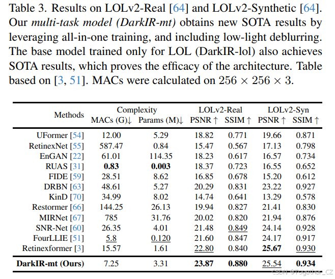 我们的模型 DarkIR 在 LOLBlur 和 Real-LOLBlur 数据集上取得新的最先进结果,相比 LEDNet [74] PSNR 提升 +1 dB,同时计算量更低。