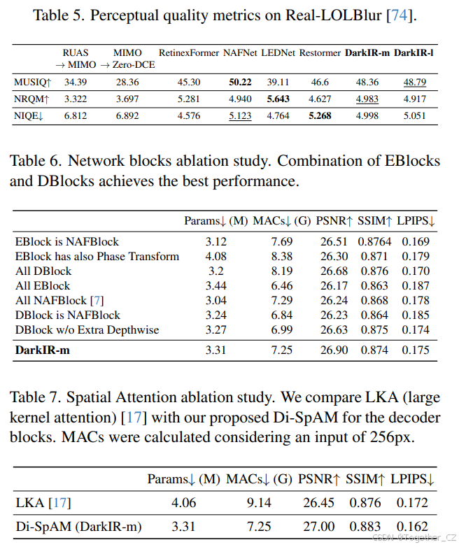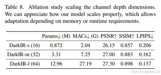 通过 EBlock 与 DBlock,DarkIR 参数量比 LEDNet [74] 减少 55%,比 Restormer [66] 减少 88%。以 256×256 输入为例: