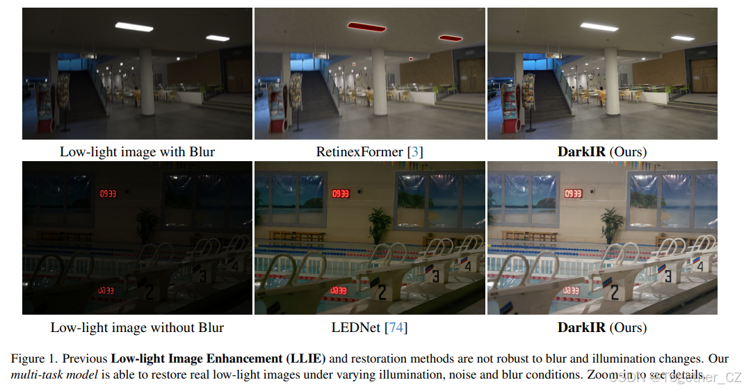 图注:以往的低光照图像增强(LLIE)与复原方法对模糊和光照变化不鲁棒。我们的多任务模型能够在真实低光照、噪声和模糊条件下复原图像。请放大查看细节。