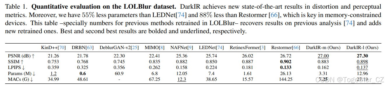 在 LOLBlur、LOLv2、Real-LOLBlur 等数据集上PSNR 提升 1 dB 以上 ,参数比 LEDNet 少 55% ,比 Restormer 少 88%;