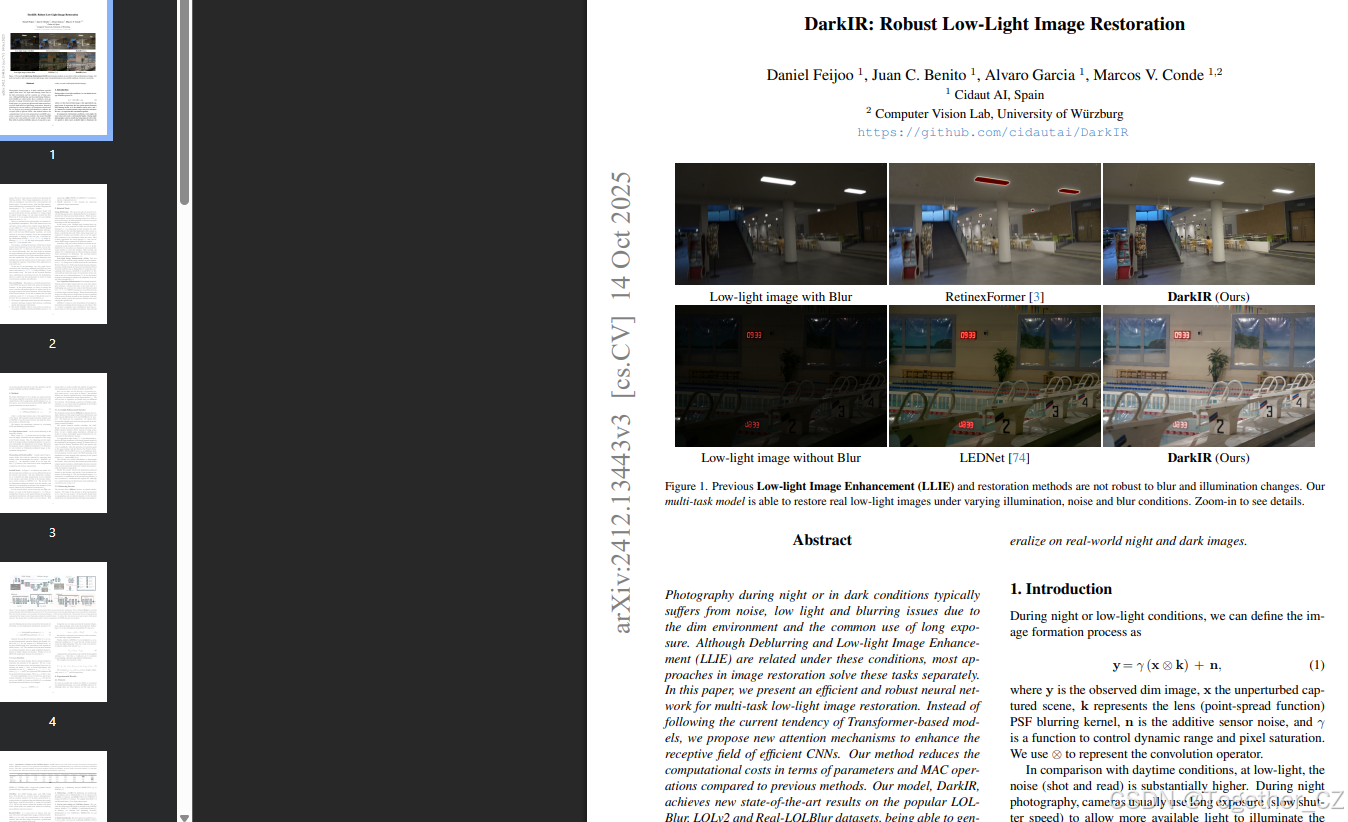 我们提出了一种多任务低光照增强与复原模型 DarkIR。该网络高效鲁棒,可同时去噪、去模糊并增强暗光/夜间图像。DarkIR 在 LOLBlur、LOLv2 和 Real-LOLBlur 数据集上取得新的最先进结果,并在真实夜间模糊图像上表现良好,且比现有方法更高效。