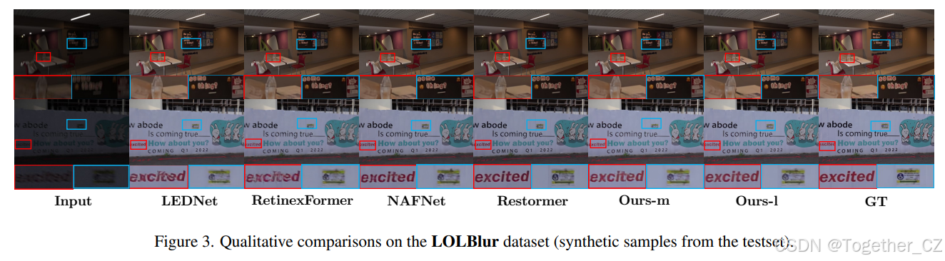 右侧:低光照图像无模糊;LEDNet [74];DarkIR(本文)