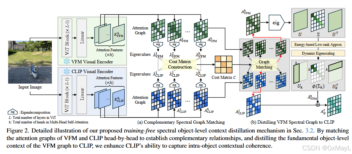 - CASS :把 VFM attention 当 图 ,用 谱方法抽取"物体级结构低秩主成分",并且解决了多头对齐(head matching)这个细节,然后蒸馏回 CLIP attention(从机制上强化 intra-object coherence)。