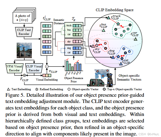 - 用 patch 视觉特征里"最像该类"的 top-n patch 向量平均得到方向 (\mu_n),把该类的文本 embedding 往 (\mu_n) 拉:
