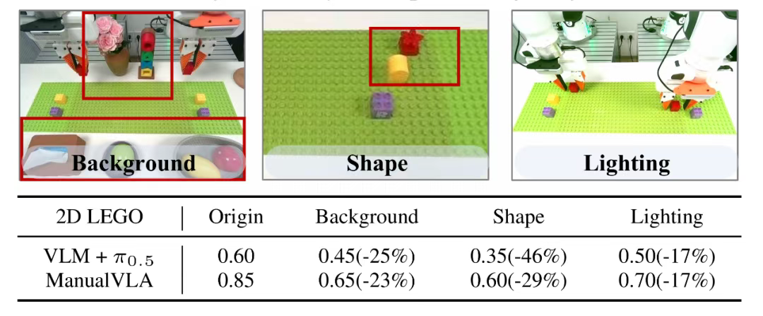 ▲ 表 4 | 我们探究了如下因素对任务成功率的影响:(a) 说明书中包含的信息;(b) 显式与隐式的 ManualCoT 思维链机制;© MoT 架构与 action 生成范式。▲ 表 5 | 在明显变化且模型未见过的背景、物体形状和光照变化下,ManualVLA 的任务成功率。