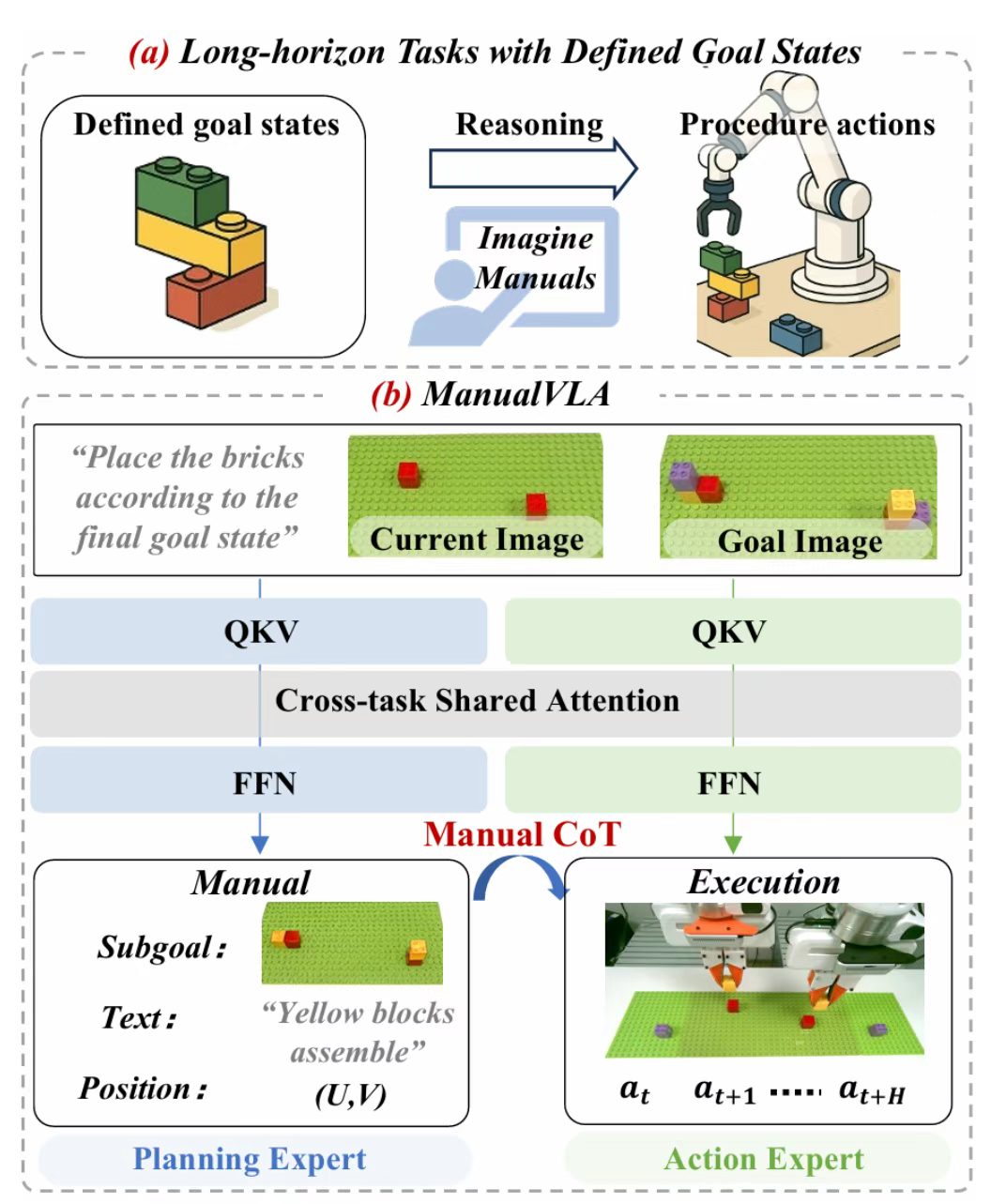 首先由「规划专家」生成由图像、空间位置提示和文字说明组成的多模态操作说明书,再通过显式与隐式相结合的「思维链」(ManualCoT)推理,将信息反馈给「动作专家」,为每一步操作提供清晰的显式控制条件的同时,通过潜在表征为动作生成提供持续的隐式引导,实现理解与生成的高度统一。