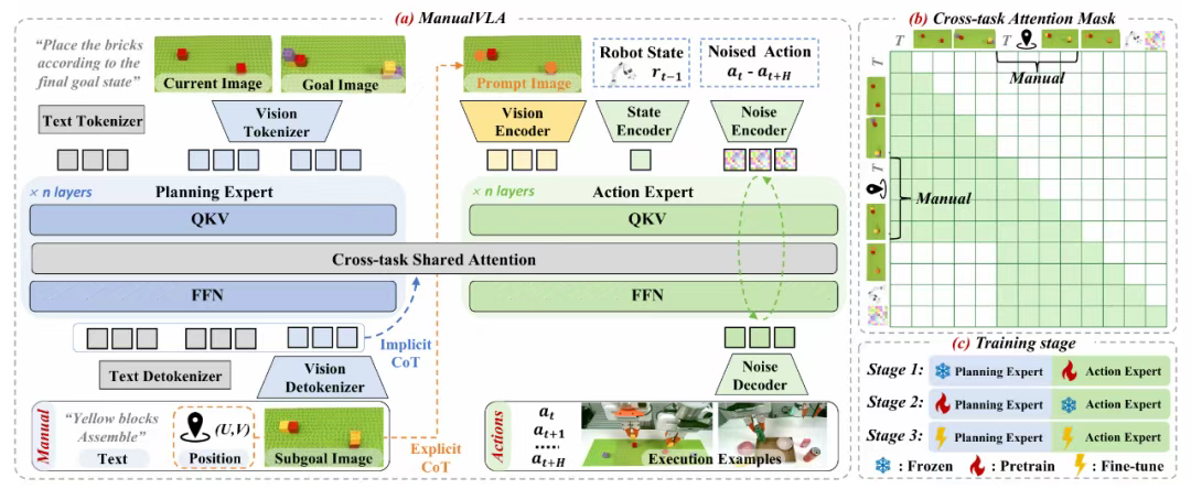 ▲ 图 2 | (a) 该框架包含两个专家模块:负责生成多模态「说明书」的规划专家,以及负责预测精确动作的动作专家。规划专家处理人类指令、当前图像和最终目标图像,生成结合了下一步图像、位置坐标和子任务指令的中间手册。我们引入了一个显式思维链 (Explicit CoT) 推理过程,其中每个位置指示符都作为一个视觉提示 (Visual Prompt) 嵌入到动作专家的观测输入中。(b) 结合跨任务共享注意力机制和专门设计的 Attention mask,生成的「说明书」token 也被用作动作生成的条件信号,从而实现了一种能有效引导动作专家的隐式思维链 (Implicit CoT) 推理过程。