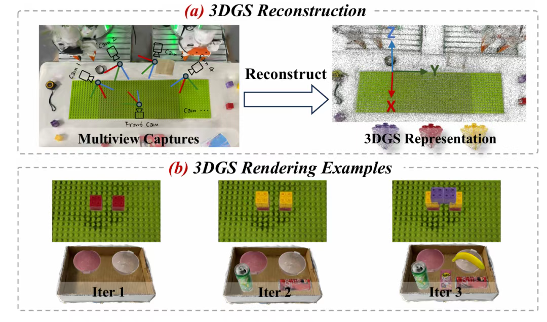 ▲ 图 3 | 数字孪生示例 (a) 我们重建了 3D 高斯溅射表征,随后将其分解为乐高底板和单个积木。(b) 我们逐步地将积木放置在底板上/将物体放置在盒子上。