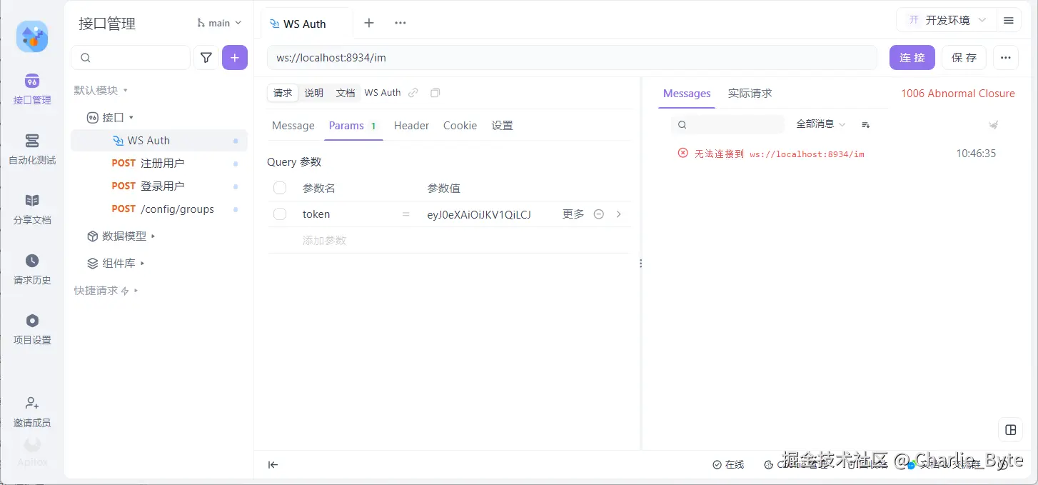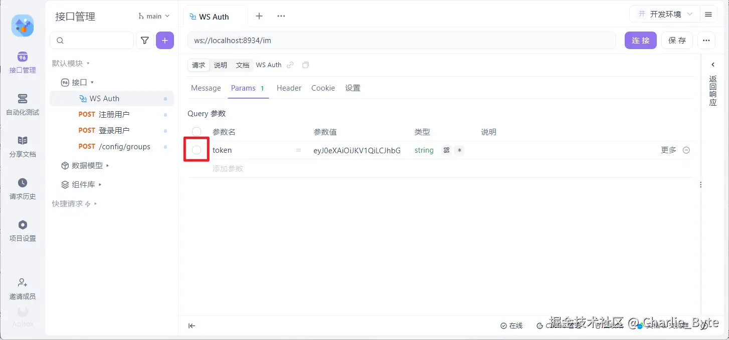 想看看效果?可以用 Apifox 模拟 WebSocket 连接。