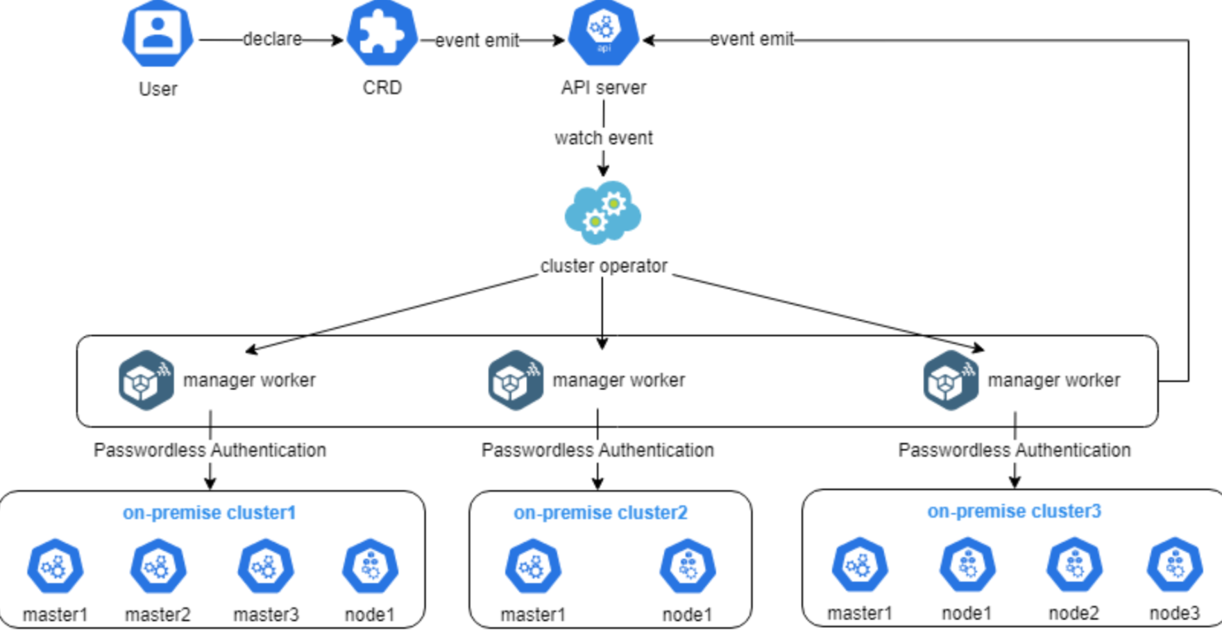 声明式管理:Kurator全面采用"Infrastructure-as-Code"理念,所有资源(集群、节点、VPC等)都可以通过声明式配置进行管理。这种模式不仅提高了管理效率,也增强了系统的可审计性和可重复性。