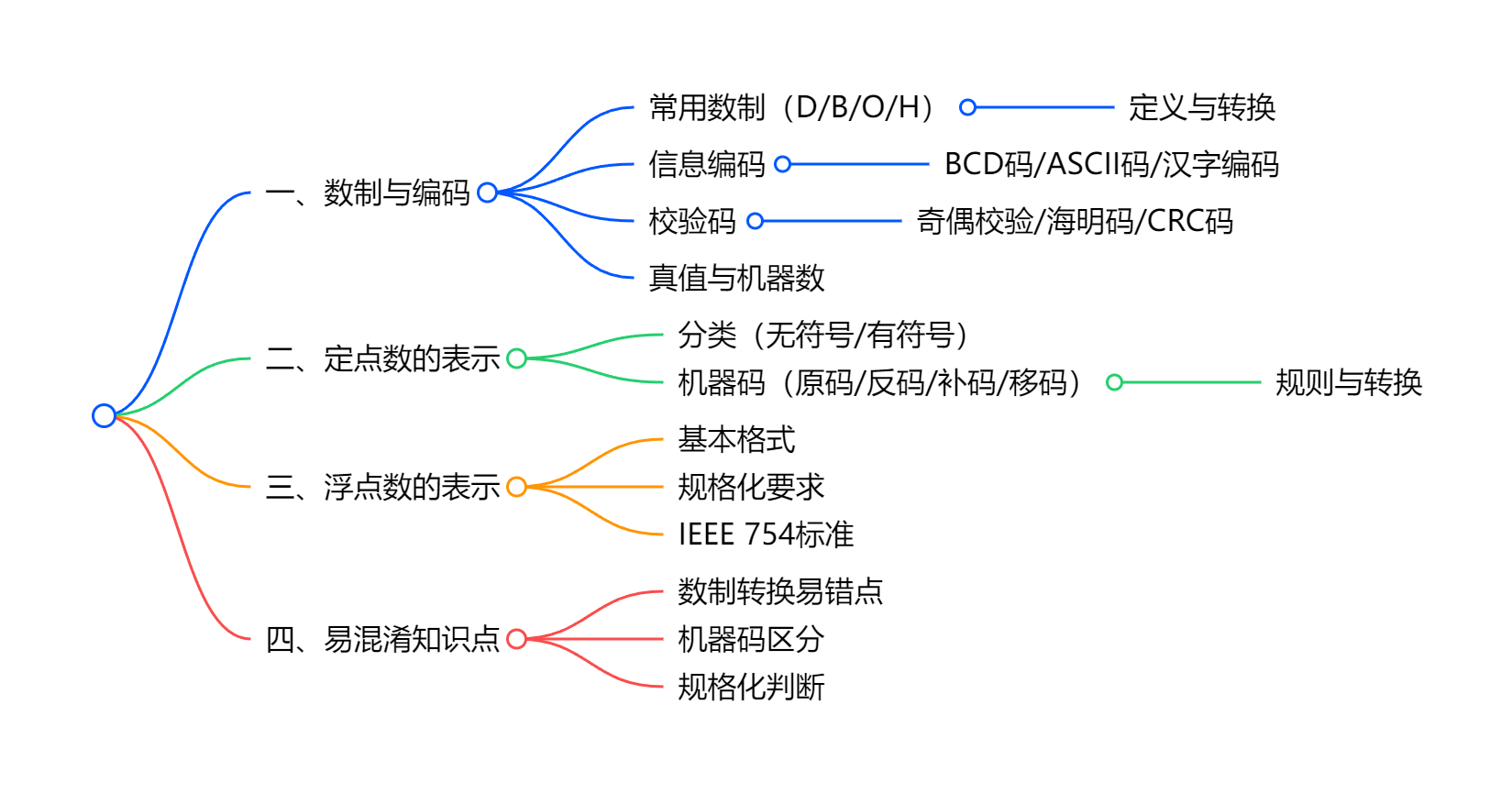 本章核心围绕计算机中数据的编码规则与表示方法展开,重点掌握数制转换、机器码表示、定点 / 浮点数格式及校验码应用,以下是结构化重点提炼及思维导图框架: